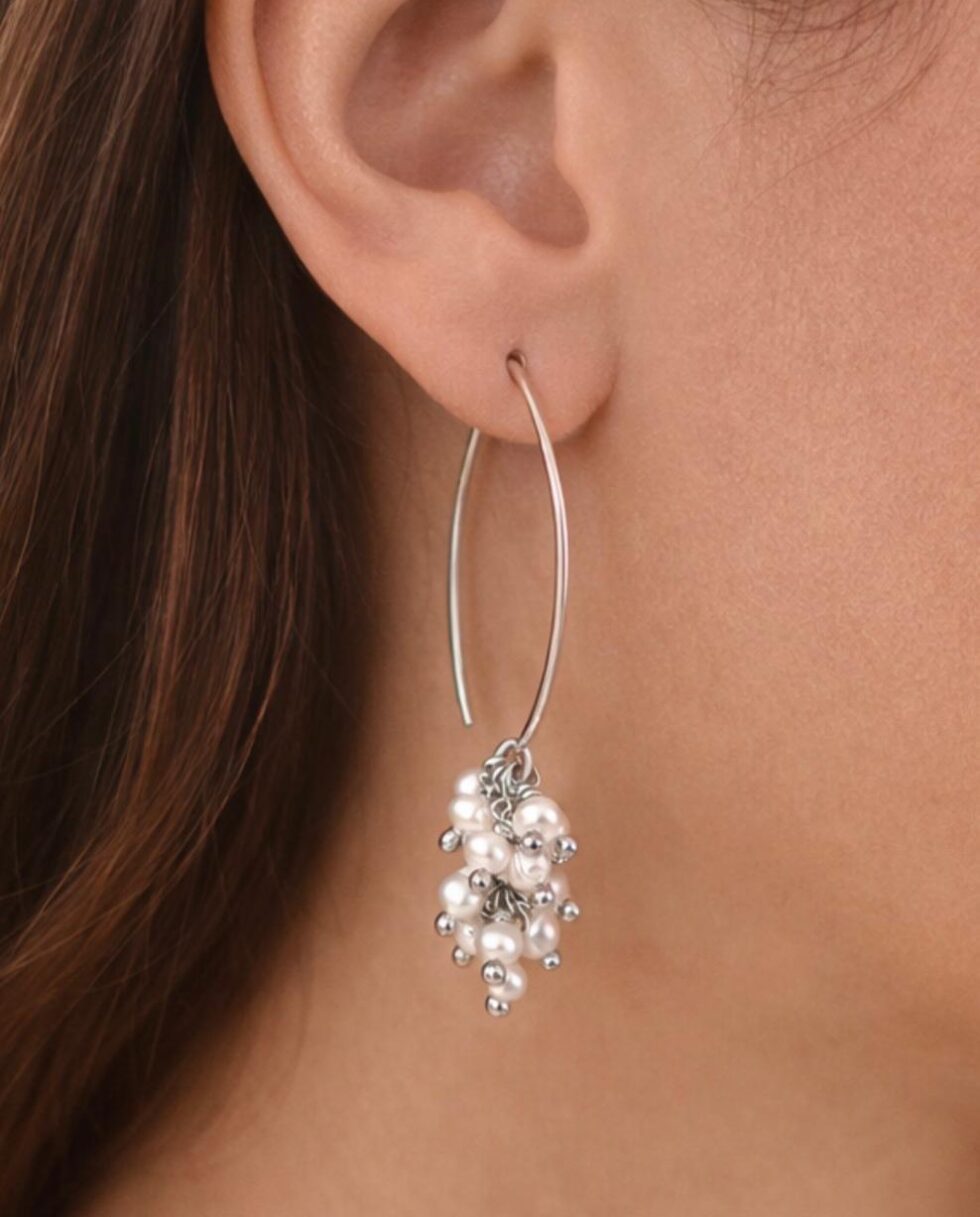 El pendiente Stella de plata con perlas es una joya elegante y original, diseñada para aportar un toque especial a cualquier look. Elaborado con un pendiente tipo gancho y un colgante compuesto por perlas de 3 mm montadas con ajugas de plata y formando un pequeño racimo.