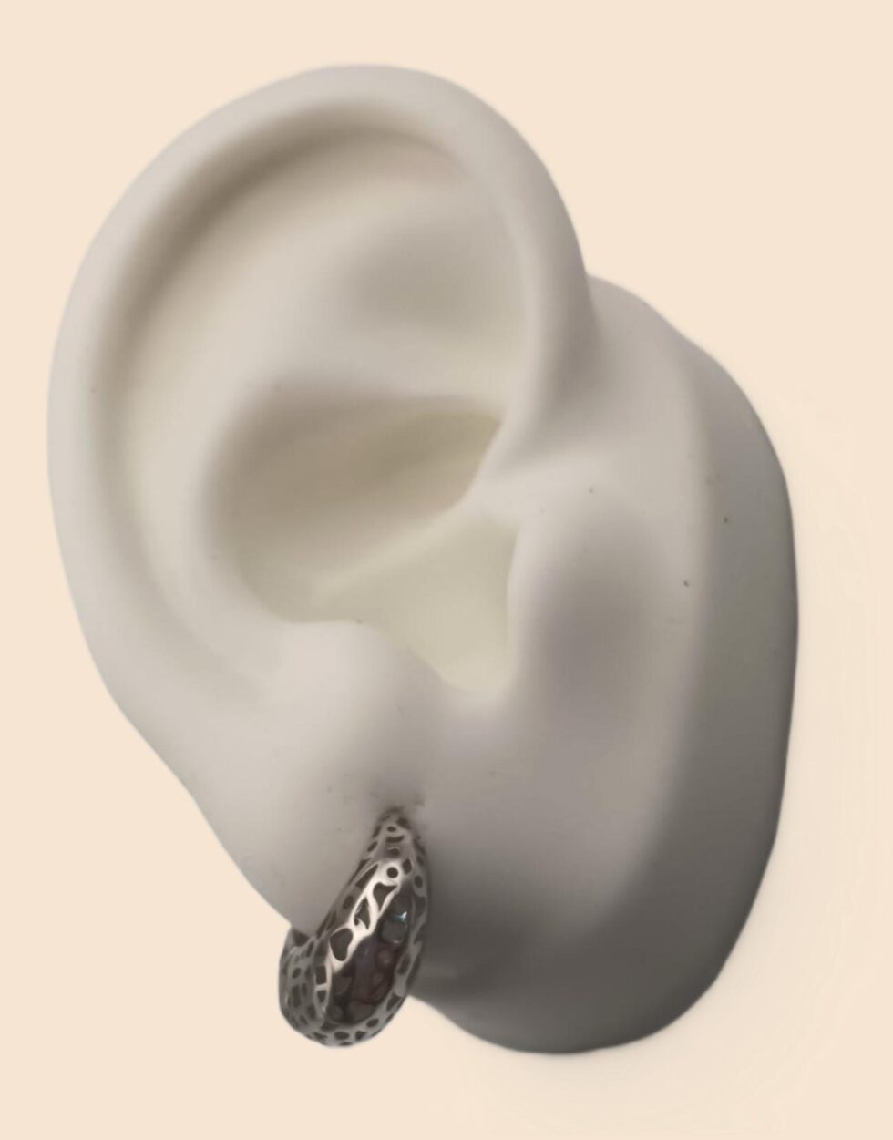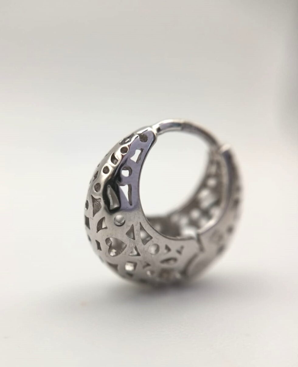 Perfecto para quienes valoran los detalles y la calidad, este aro con diseño calado es una incorporación elegante a cualquier colección de joyería contemporánea.