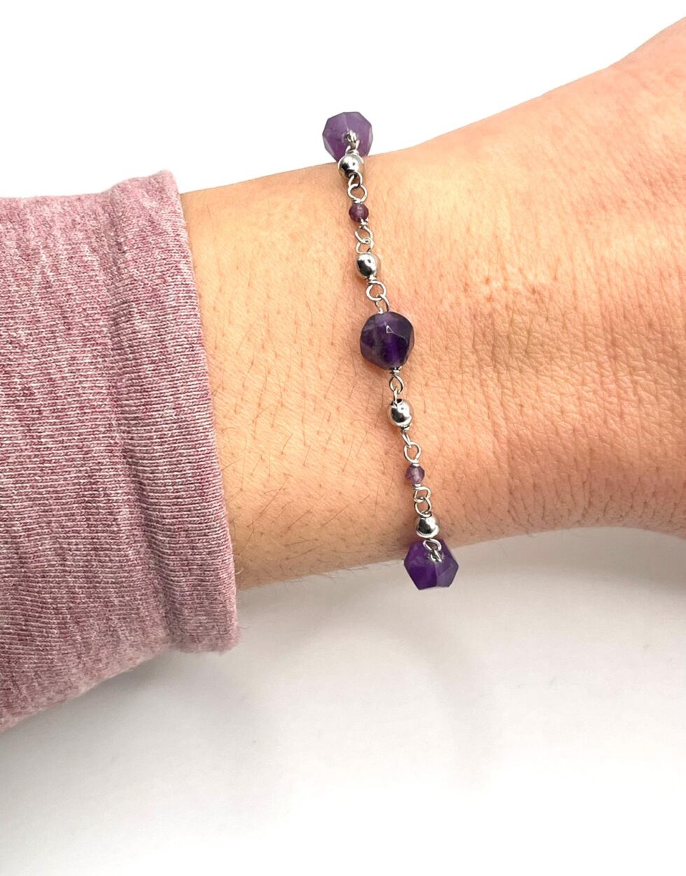 La recién llegada a nuestra colección de cadena de rosario con minerales. La pulsera Amatista rosario plata es una joya versátil, cómoda y que aporta un toque de color a tus looks. Fabricada a mano en plata de ley 925, esta pulsera es una ejemplo de artesanía, delicadeza y exclusividad, ya que cada pieza es única.