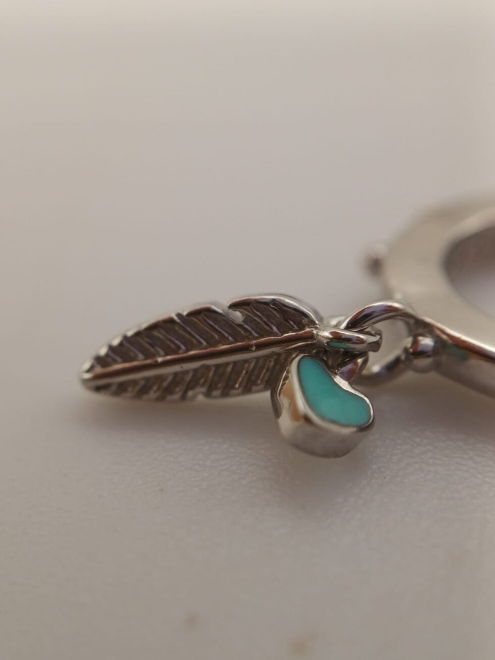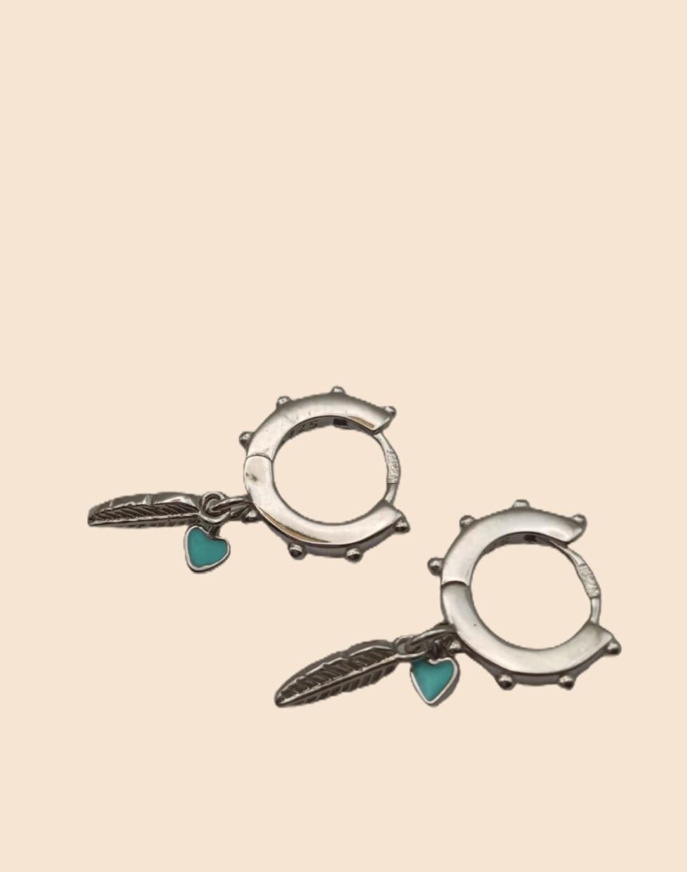 El diseño parte de un pequeño aro decorado con sutiles salientes, que le otorgan textura y carácter sin perder elegancia. De él cuelgan dos encantadores colgantes que aportan movimiento y un toque único: una pluma estilizada, símbolo de libertad y ligereza, y un corazón esmaltado en azul claro, que introduce un acento de color suave y lleno de dulzura.