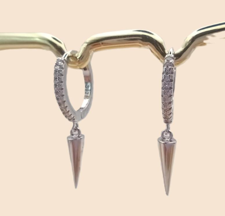 La pieza se compone de un pequeño aro con circonitas blancas engastadas, que aporta luminosidad y un toque sofisticado. Desde él cuelga un colgante en forma de cono, tipo pincho, que introduce un aire contemporáneo y ligeramente punk, ideal para quienes quieren marcar la diferencia con estilo.